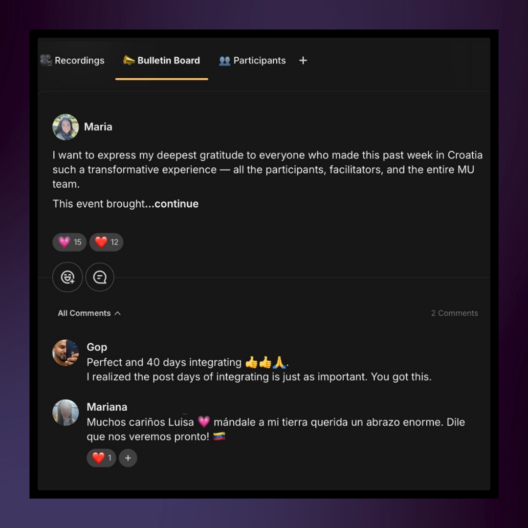 “No words can truly express the depth of this 7-day retreat…It was a profound homecoming, it cracked me wide open. The love, devotion, and purity of heart I witnessed touched me beyond measure. I am deeply in love with Life and feel more aligned than ever with God’s mission flowing through me. Thank you for this once-in-a-lifetime experience of returning home to God’s love.”